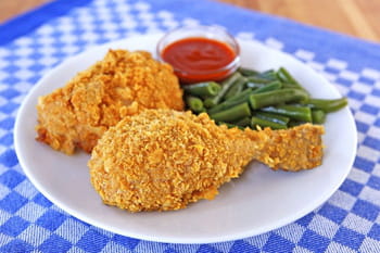 يُسخن الزيت وتُقلى قطع الدجاج حتى تكتسب اللون الذهبي وتُقدم مع البطاطس المقلية والكاتشب أو حسب الرغبة.
